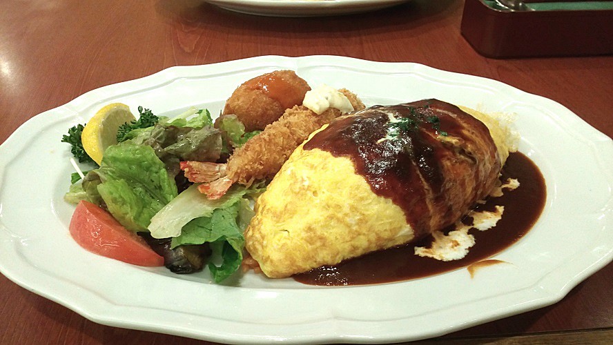 デミグラスソースオムライスとエビフライ&カキフライのボリューム満点のセットメニューです。